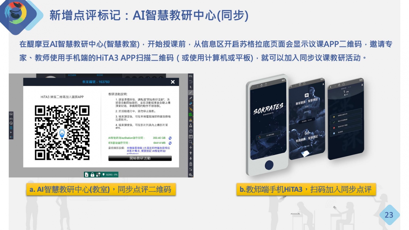 在醍摩豆AI智慧教研中心(智慧教室),開始授課前,從資訊區(qū)開啟蘇格拉底頁(yè)面會(huì)顯示議課APP二維碼,邀請(qǐng)專家、教師使用手機(jī)端的HiTA3 APP掃描二維碼(或使用電腦或平板),就可以加入同步議課教研活動(dòng)。