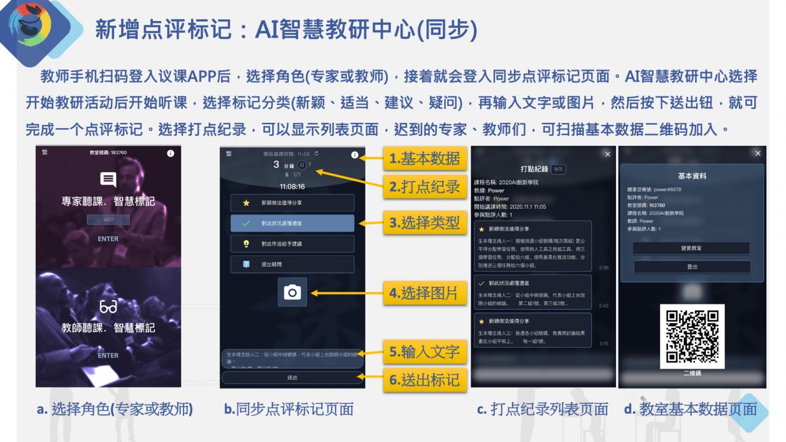 教師手機(jī)掃碼登入議課APP后,選擇角色(專家或教師),接著就會(huì)登入同步點(diǎn)評(píng)標(biāo)記頁(yè)面。AI智慧教研中心選擇開始教研活動(dòng)后開始聽課,選擇標(biāo)記分類(新穎、適當(dāng)、建議、疑問),再輸入文字或圖片,然后按下送出鈕,就可完成一個(gè)點(diǎn)評(píng)標(biāo)記。選擇打點(diǎn)紀(jì)錄,可以顯示清單頁(yè)面,遲到的專家、教師們,可掃描基本資料二維碼加入。