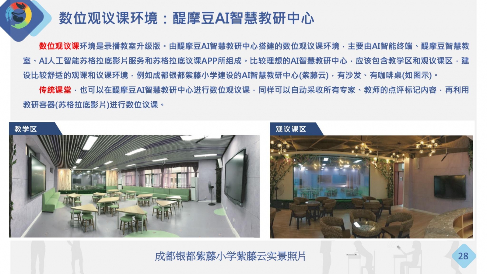 數(shù)位觀議課環(huán)境是錄播教室升級(jí)版。由醍摩豆AI智慧教研中心搭建的數(shù)位觀議課環(huán)境,主要由AI智能終端、醍摩豆智慧教室、AI人工智能蘇格拉底影片服務(wù)和蘇格拉底議課APP所組成。比較理想的AI智慧教研中心,應(yīng)該包含教學(xué)區(qū)和觀議課區(qū),建設(shè)比較舒適的觀課和議課環(huán)境,例如成都銀都紫藤小學(xué)建設(shè)的AI智慧教研中心(紫藤云),有沙發(fā)、有咖啡桌(如圖示)。