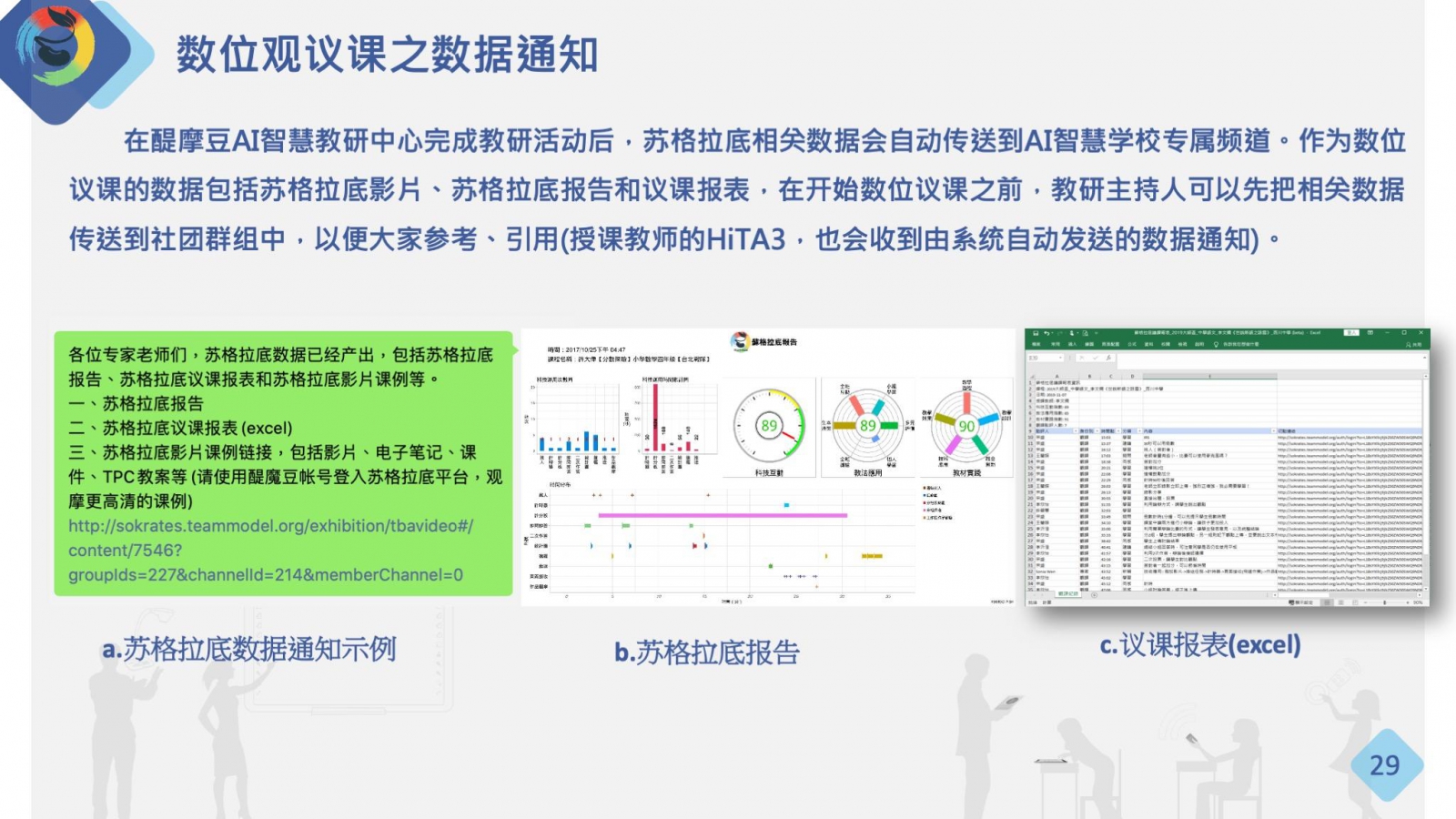 在醍摩豆AI智慧教研中心完成教研活動(dòng)后,蘇格拉底相關(guān)數(shù)據(jù)會(huì)自動(dòng)傳送到AI智慧學(xué)校專屬頻道。作為數(shù)位議課的數(shù)據(jù)包括蘇格拉底影片、蘇格拉底報(bào)告和議課報(bào)表,在開始數(shù)位議課之前,教研主持人可以先把相關(guān)數(shù)據(jù)傳送到社團(tuán)群組中,以便大家參考、引用(授課教師的HiTA3,也會(huì)收到由系統(tǒng)自動(dòng)發(fā)送的數(shù)據(jù)通知)。