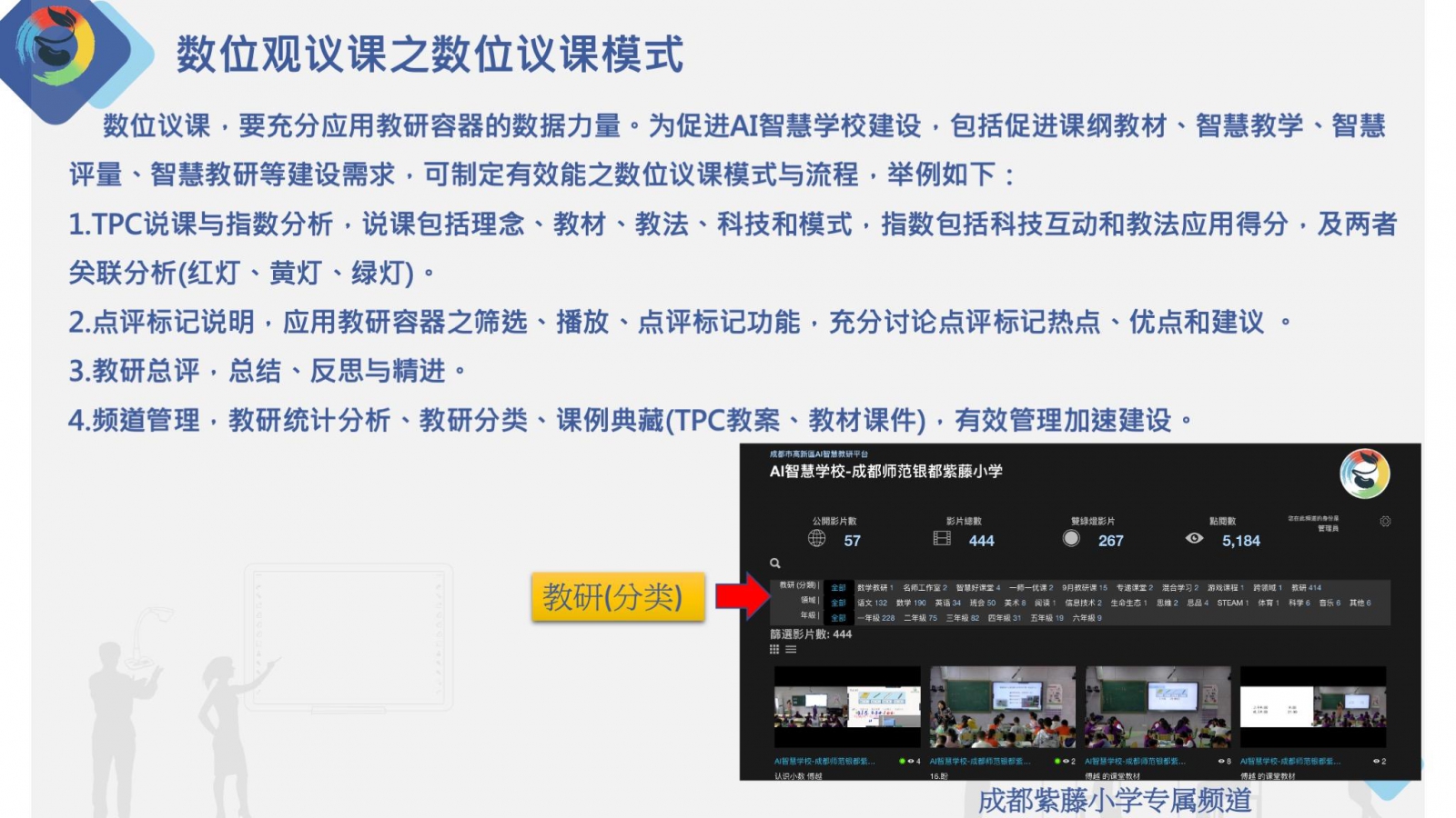4.頻道管理,教研統(tǒng)計(jì)分析、教研分類、課例典藏(TPC教案、教材課件),有效管理加速發(fā)展。