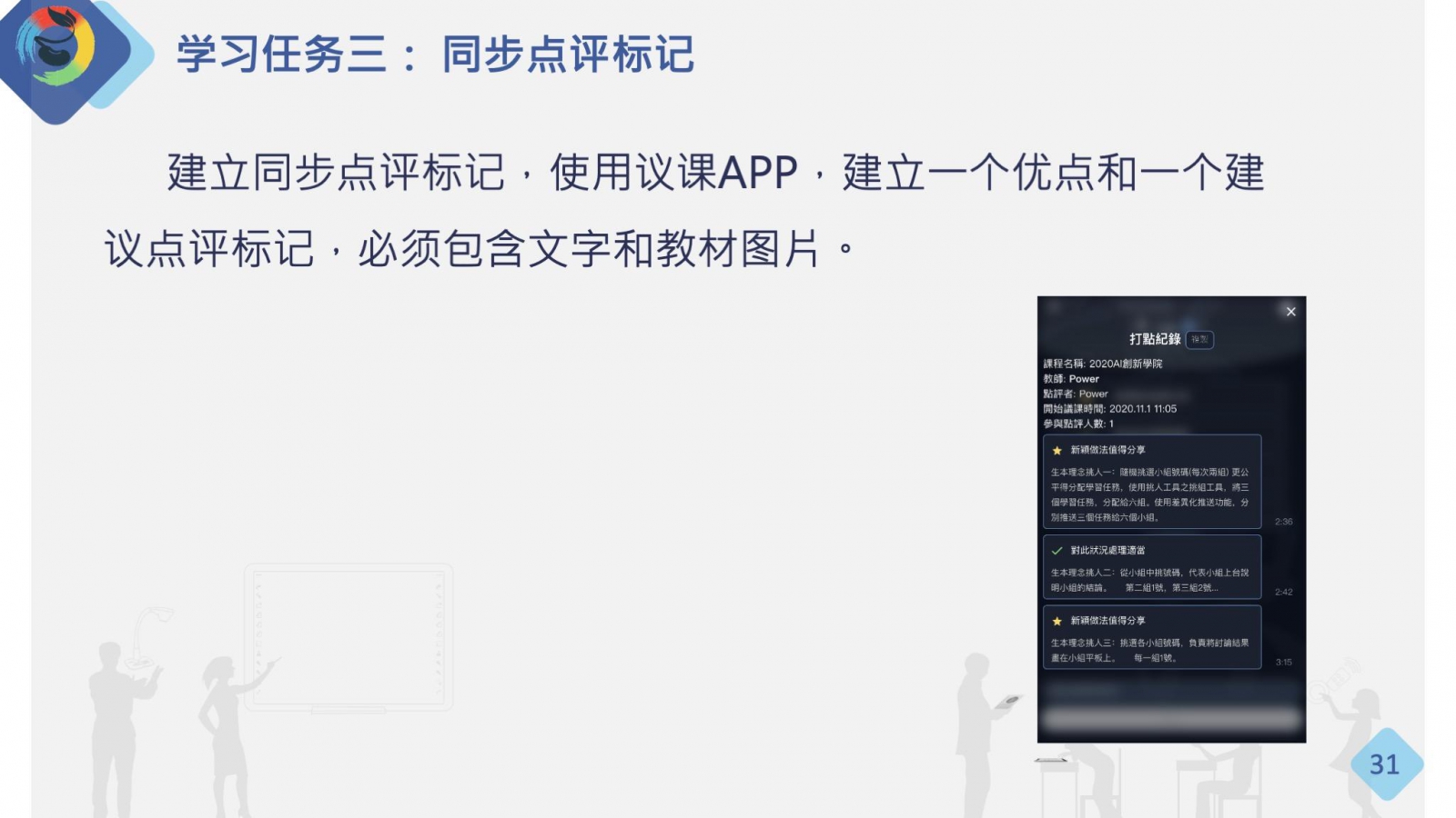 建立同步點(diǎn)評(píng)標(biāo)記,使用議課APP,建立一個(gè)優(yōu)點(diǎn)和一個(gè)建議點(diǎn)評(píng)標(biāo)記,必須包含文字和教材圖片