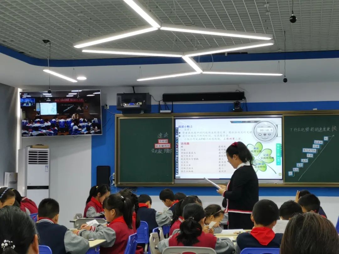 早在一周前的5月18日,浙江省“互聯(lián)網(wǎng)+義務(wù)教育”鄞州實(shí)驗(yàn)區(qū)小學(xué)專場(chǎng)活動(dòng)在鄞州區(qū)江東中心小學(xué)與東吳鎮(zhèn)中心小學(xué)并機(jī)直播。小學(xué)專場(chǎng)活動(dòng)當(dāng)天,鄞州區(qū)教育局教育科林鋼斌科長(zhǎng)、鄞州區(qū)教育局教研室金曉潤(rùn)主任以及鄞州區(qū)教育局教裝中心胡震珍主任出席本次活動(dòng),來自區(qū)內(nèi)“互聯(lián)網(wǎng)+義務(wù)教育”實(shí)施學(xué)校的近四十名教師代表們現(xiàn)場(chǎng)參與活動(dòng),還有上百名區(qū)內(nèi)學(xué)校領(lǐng)導(dǎo)和教師通過網(wǎng)絡(luò)直播關(guān)注本場(chǎng)活動(dòng),用手機(jī)積極參與在線智慧觀課。本次活動(dòng)以課例呈現(xiàn),觀點(diǎn)報(bào)告,互動(dòng)交流等形式開展,旨在探索同步遠(yuǎn)程教學(xué)和遠(yuǎn)程教研的方式。城鄉(xiāng)同步智慧課堂——語文課