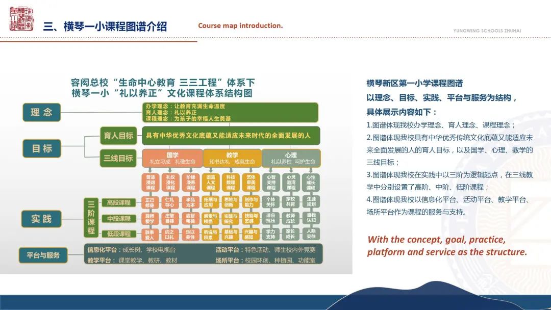 橫琴一小結(jié)合教育教學(xué)實(shí)際,將國(guó)學(xué)、教學(xué)、心理三線課程進(jìn)行了橫向整合,構(gòu)建了“禮立習(xí)成 · 禮敬生命“、“禮養(yǎng)心性 · 呵護(hù)生命”、“知書達(dá)禮 · 成就生命”的三線總體目標(biāo),推進(jìn)課程變革,豐富課程內(nèi)涵,逐步形成“多元、開放、整體,動(dòng)態(tài)、和諧、可持續(xù),自主、合作、共生”的新生態(tài)教育體系。