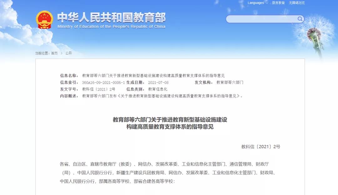 近日,教育部等六部門印發(fā)《關(guān)于推進(jìn)教育新型基礎(chǔ)設(shè)施建設(shè)構(gòu)建高質(zhì)量教育支撐體系的指導(dǎo)意見》,提出到2025年,基本形成結(jié)構(gòu)優(yōu)化、集約高效、安全可靠的教育新型基礎(chǔ)設(shè)施體系,并通過迭代升級(jí)、更新完善和持續(xù)建設(shè),實(shí)現(xiàn)長期、全面發(fā)展。