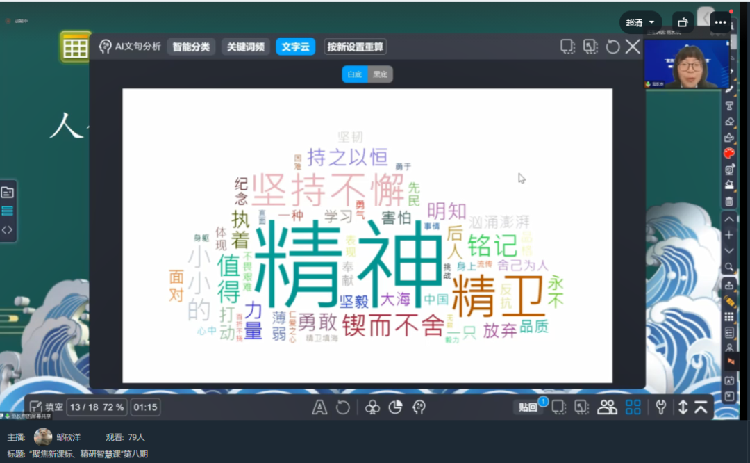最具亮點(diǎn)的地方是讓學(xué)生用一句話說(shuō)出“精衛(wèi)填海故事值得被后人銘記的原因是什么”,學(xué)生作答后,出現(xiàn)的一片美麗的“文字云”,最醒目的就是“鍥而不舍”“堅(jiān)持不懈”“精神”等字眼,一下將精衛(wèi)的精神進(jìn)行提煉升華,讓人印象深刻。