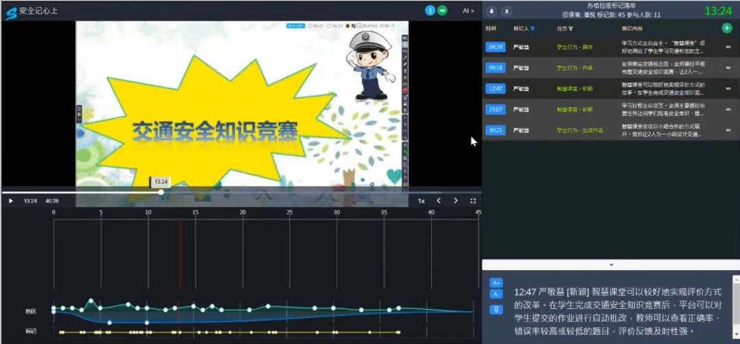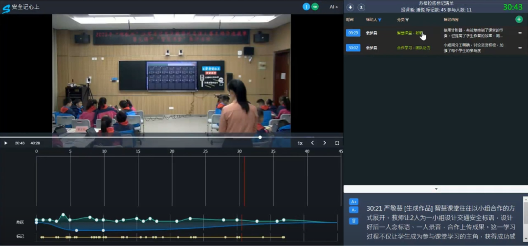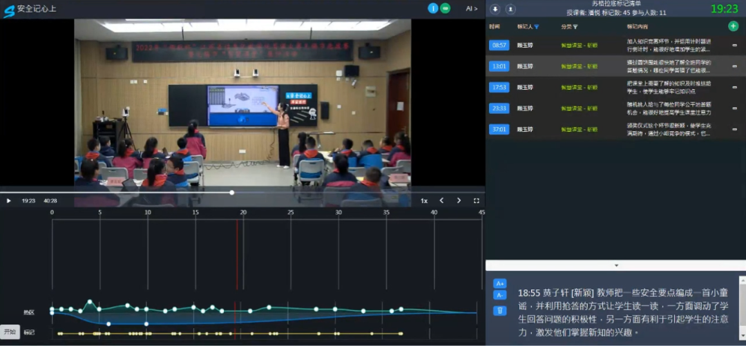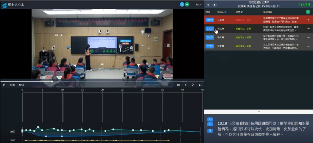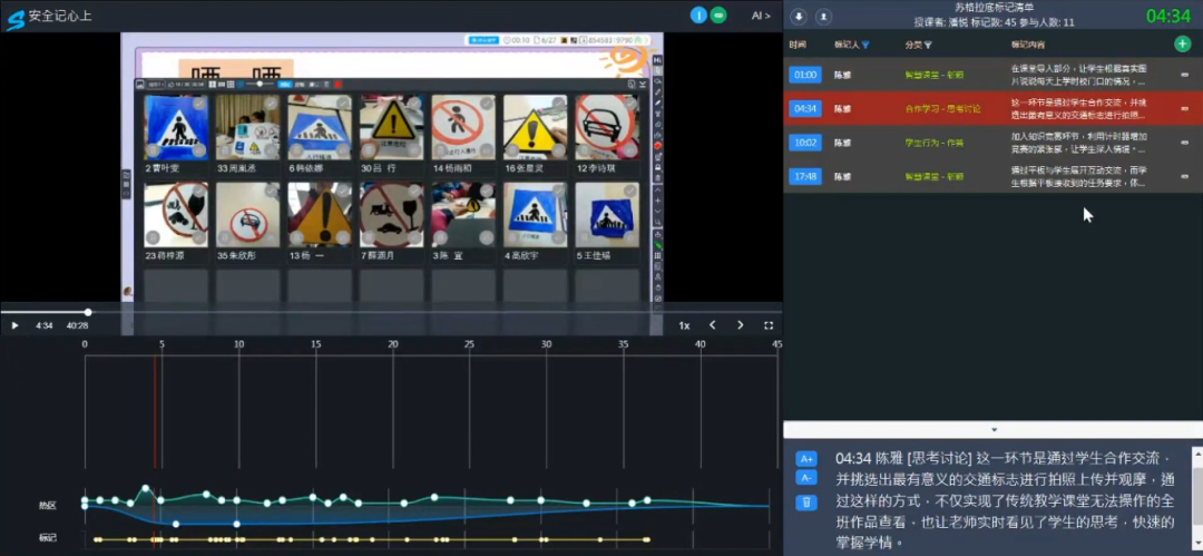 值得一提的是,本次課例展示過程中,聽課老師通過蘇格拉底議課APP可以邊觀課邊打點(diǎn),展示課結(jié)束后,所有打點(diǎn)標(biāo)記均展示在蘇格拉底平臺(tái),老師們的觀課意見一目了然。首先點(diǎn)評(píng)的是宜興市經(jīng)濟(jì)技術(shù)開發(fā)區(qū)實(shí)驗(yàn)小學(xué)陳雅老師,她從課堂教學(xué)、合作學(xué)習(xí)、學(xué)生行為對(duì)本節(jié)課進(jìn)行點(diǎn)評(píng),她高度認(rèn)可老師帶領(lǐng)學(xué)生合作學(xué)習(xí)的教學(xué)方式,作品觀摩讓老師看見了學(xué)生的思考,精準(zhǔn)掌握了學(xué)情。