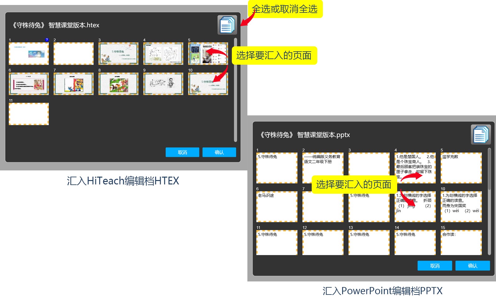 匯入HiTeach 5編輯的檔案格式HTEX或者PowerPoint編輯的檔案格式PPTX時(shí),提供頁面選擇界面,讓您只挑想要匯入的頁面插入。選頁時(shí),可點(diǎn)選右上角的全選或取消全選按鈕,快速控制選頁。