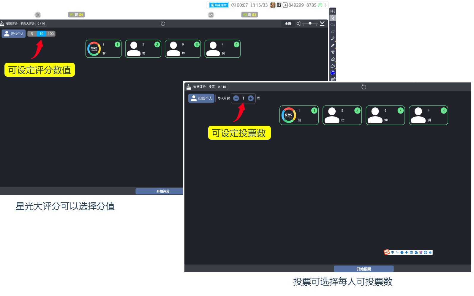 直接由作品任務(wù)和文字題帶到智慧評(píng)分應(yīng)用時(shí),星光大評(píng)分功能可以選擇 "分值",投票可以選擇 "票數(shù)"。