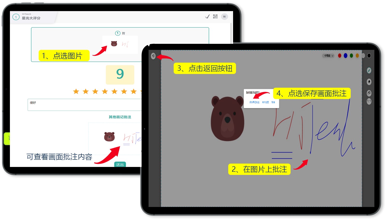 圖片作品進(jìn)行智慧評(píng)分時(shí),學(xué)生除了給分、評(píng)語之外,也可以做標(biāo)記回傳。評(píng)分時(shí),點(diǎn)選需要評(píng)分的作品,可利用畫筆在圖片上批注、寫字。完成后,點(diǎn)選返回按鈕,選擇保存畫記批注,在點(diǎn)選送出按鈕之后,就會(huì)連同批注內(nèi)容一并送出。