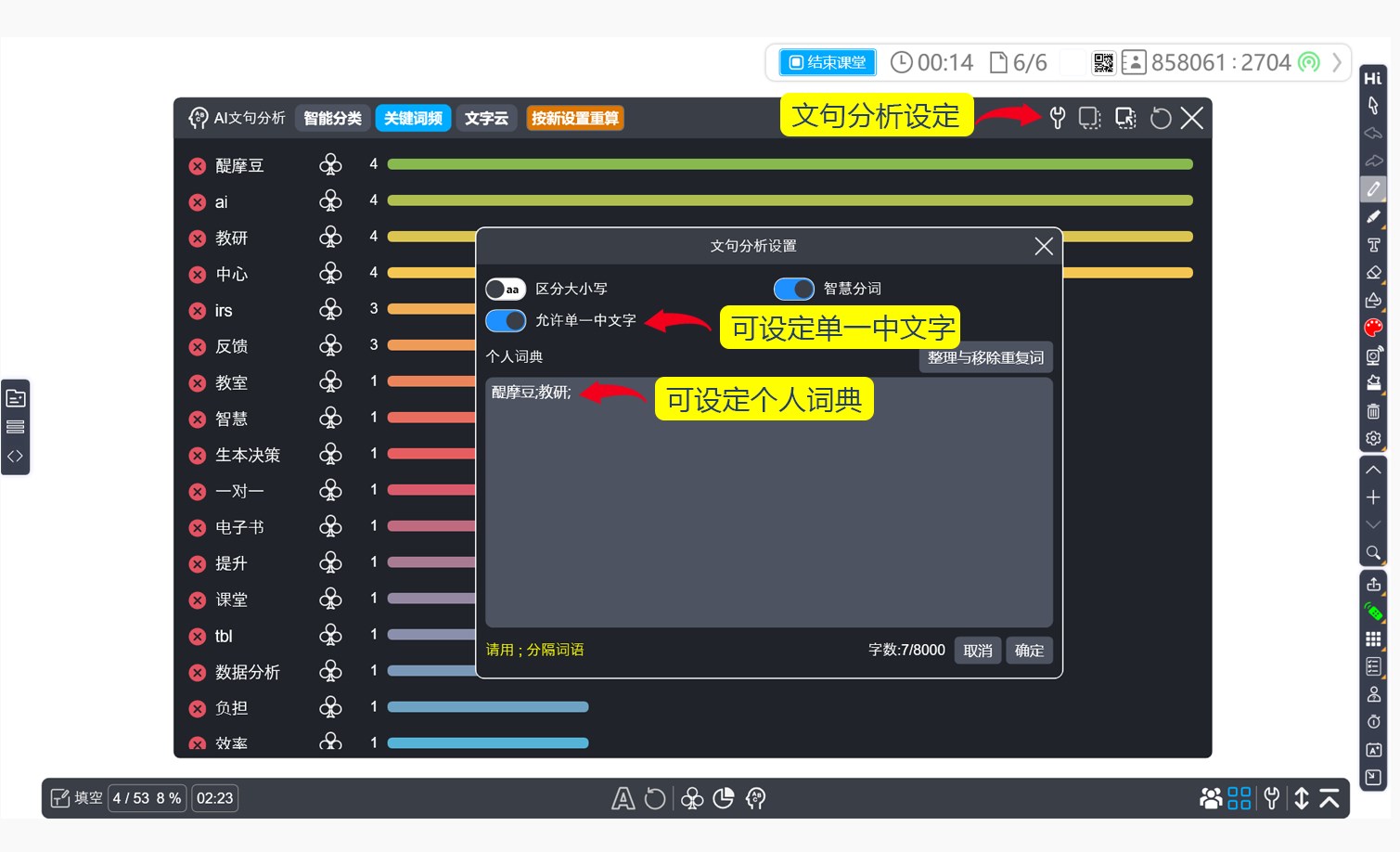 AI文句分析功能增強(qiáng)使用者設(shè)定機(jī)制,可以適應(yīng)更多元的教學(xué)需求。例如,單一中文字的教學(xué)時(shí),允許老師開啟單一中文字的功能;有些AI不認(rèn)識(shí)的詞,老師可以自行定義詞典。