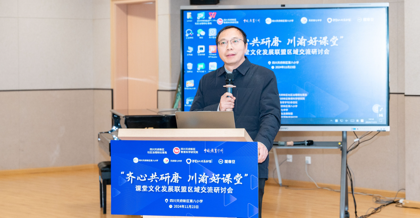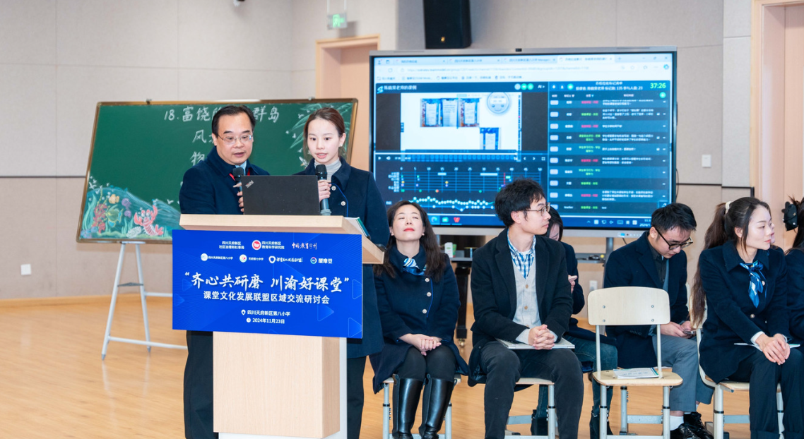 2024年11月23日,由四川天府新區(qū)社區(qū)治理和社事局主辦,醍摩豆智慧教育研究院協(xié)辦的“齊心共研磨 川渝好課堂——課堂文化發(fā)展聯(lián)盟區(qū)域交流研討會”在四川天府新區(qū)第八小學圓滿落幕。此次研討會匯聚了重慶、青海、北京、陜西眾多教育界專家、學者及一線教育工作者,共同探討課堂文化發(fā)展與教育改革創(chuàng)新,為區(qū)域教育發(fā)展注入新活力。 在領(lǐng)導(dǎo)致辭環(huán)節(jié),四川天府新區(qū)教育衛(wèi)健工委委員,社區(qū)治理和社事局黨組成員、副局長陳頎發(fā)表了熱情洋溢的歡迎辭,對各位嘉賓的到來表示誠摯歡迎。 《中國教育學刊》雜志社編委會副主任、編審馬憲平也表達了對此次活動的高度認可與期待,希望通過此次交流研討會,能夠匯聚各方智慧,共同探索教育發(fā)展的新路徑。同時,馬書記強調(diào)了教育在現(xiàn)代化建設(shè)中的基礎(chǔ)性、戰(zhàn)略性支撐作用,以及推進教育數(shù)字化的重要性。 天府八小羅艷梅校長進行了學校辦學成果匯報,詳細展示了學校在課改方面取得的成果。她從學校的基本情況、辦學理念和育人目標,以及落實新課標、推動課堂教學變革的具體措施進行了詳細闡述,強調(diào)了國家課程育人要求與學校育人目標的精準對接,以及素養(yǎng)導(dǎo)向的課程體系建設(shè)的重要性。 隨后,來自四川天府新區(qū)第八小學的陳曉棠老師呈現(xiàn)了一堂精彩紛呈的四年級語文示范課《富饒的西沙群島》。陳曉棠老師用小組合作的形式,讓學生關(guān)注關(guān)鍵詞和關(guān)鍵句,理解海島的特點,通過作品展示,引導(dǎo)學生自主思考、主動展示,并用”發(fā)朋友圈“這一真實情景進行師生評價,生生評價,最后交由在場的專家老師們評價,在熱鬧的課堂氛圍中鞏固了學生的知識。 醍摩豆智慧教育研究院秘書長劉彬針對本堂課進行智慧教研,他根據(jù)平臺記錄提取評議沖突點、熱點、疑點生成教研主題,老師們依據(jù)教學切片進行研討,各抒己見,有答疑、有思考、有爭辯更有收獲。蘇格拉底平臺的運用實現(xiàn)了研討的開放、精準和共享,在技術(shù)的支持下助力教師專業(yè)發(fā)展更高效。