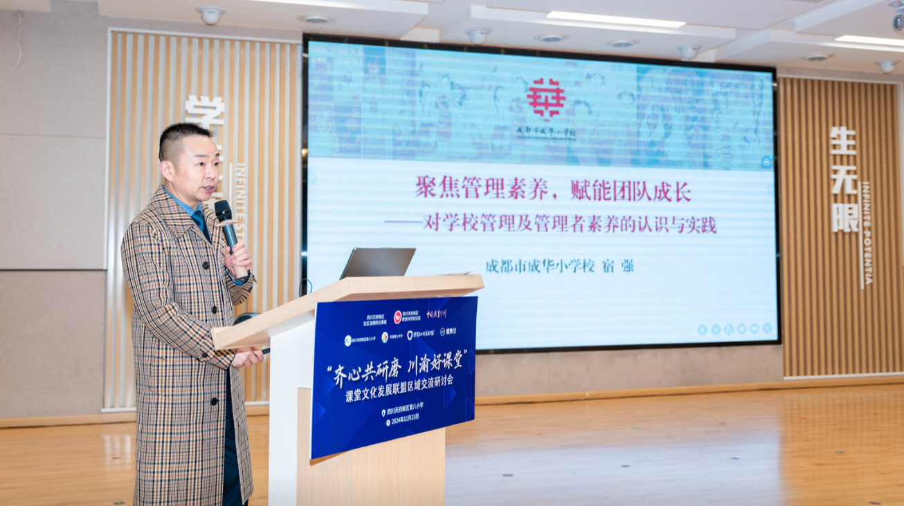 中國當代教育名家馮恩洪先生的大會主旨報告更是將活動推向高潮。馮校長深入探討中國基礎(chǔ)教育面臨的問題,包括教育發(fā)展的不均衡性,提出了個性化教育的重要性,強調(diào)了教育設(shè)計應(yīng)以促進學生的全面發(fā)展為本,提倡簡約復(fù)雜、精準把握的教育價值取向。此外,他還提出了對于教育改革的看法,認為中國教育應(yīng)走出書本中心,走進學生發(fā)展為本,注重學生的個別化發(fā)展和社會化發(fā)展的平衡。整個報告強調(diào)了教育改革的必要性和緊迫性,呼吁教育工作者共同努力,為學生創(chuàng)造更加健康、全面的成長環(huán)境。 校長報告環(huán)節(jié)中,成都市成華小學校長宿強、 重慶市巴蜀小學教育集團執(zhí)行校長張超、天府第七中學校長陳剛分別帶來《聚焦管理素養(yǎng),賦能團隊成長》《新課改理念引領(lǐng)下的“律動課堂”變革實踐》《思維品質(zhì)是好課堂的試金石》的主題報告,宿強校長分享了對學校管理及管理者素養(yǎng)的認識與實踐;張超校長介紹了新課改理念引領(lǐng)下的重慶巴蜀小學的“律動課堂”的變革與實踐;陳剛校長則從教改為什么指向思維出發(fā),闡述了提升思維品質(zhì)是好課堂的必然要求這一觀點。他們的報告從學校管理、課程建設(shè)、教師發(fā)展等多個方面為其他學校提供了寶貴的借鑒經(jīng)驗,引發(fā)了參會校長們的深入思考 。 成都市成華小學校長宿強