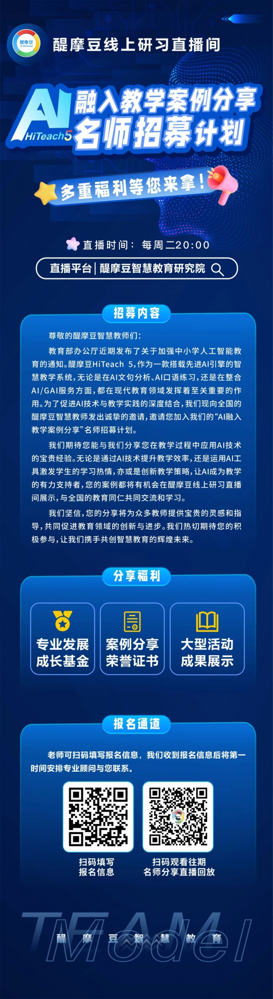 【名師招募】醍摩豆直播間“AI融入教學(xué)案例分享”名師招募計(jì)劃開啟啦,老師們快來報(bào)名吧!